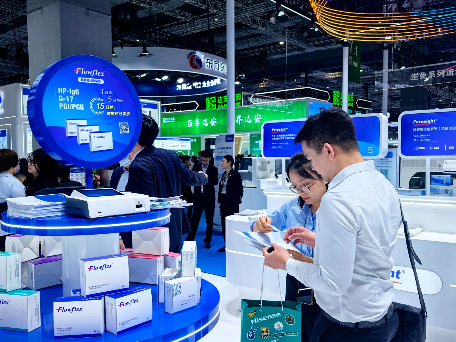 展館內(nèi)人流如織,在7.1號(hào)館核心展艾康生物以“技術(shù)普惠”為炬,點(diǎn)亮2025CMEF的舞臺(tái)。其中,快診和生化兩大技術(shù)平臺(tái)更是成為關(guān)注焦點(diǎn)。